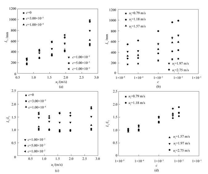為了定量表征表面張力變化對(duì)射流破裂過(guò)程的影響,實(shí)驗(yàn)測(cè)量了含表面活性劑射流的射流破裂長(zhǎng)度。射流破裂長(zhǎng)度定義為噴嘴出口至射流首次發(fā)生破裂處的距離。圖6是含表面活性劑射流破裂長(zhǎng)度隨射流速度u l的變化趨勢(shì),其中L s(mm)表示含表面活性劑射流的射流破裂長(zhǎng)度,L l(mm)為水的射流破裂長(zhǎng)度。從圖6(a)中可以看出,當(dāng)表面活性劑濃度保持不變時(shí),提高液體射流速度會(huì)增大射流破裂長(zhǎng)度。從圖6(b)中可以看出,當(dāng)液體射流速度保持不變時(shí),隨著表面活性劑濃度的增大,射流破裂長(zhǎng)度總體上呈現(xiàn)逐漸增大的趨勢(shì);射流速度越大,射流破裂長(zhǎng)度增大的趨勢(shì)就越明顯。使用相同工況下水的射流破裂長(zhǎng)度無(wú)量綱化含表面活性劑射流的破裂長(zhǎng)度后,可以得到射流破裂長(zhǎng)度比隨射流速度以及表面活性劑濃度的變化趨勢(shì),如圖6(c)、(d)所示。從圖中可以看出,表面活性劑的加入顯著增大了射流破裂長(zhǎng)度比。在表面活性劑濃度不變時(shí),提高液體射流速度對(duì)射流破裂長(zhǎng)度比的影響并不顯著。在射流速度保持不變時(shí),提高表面活性劑濃度會(huì)導(dǎo)致射流破裂長(zhǎng)度比的增大。