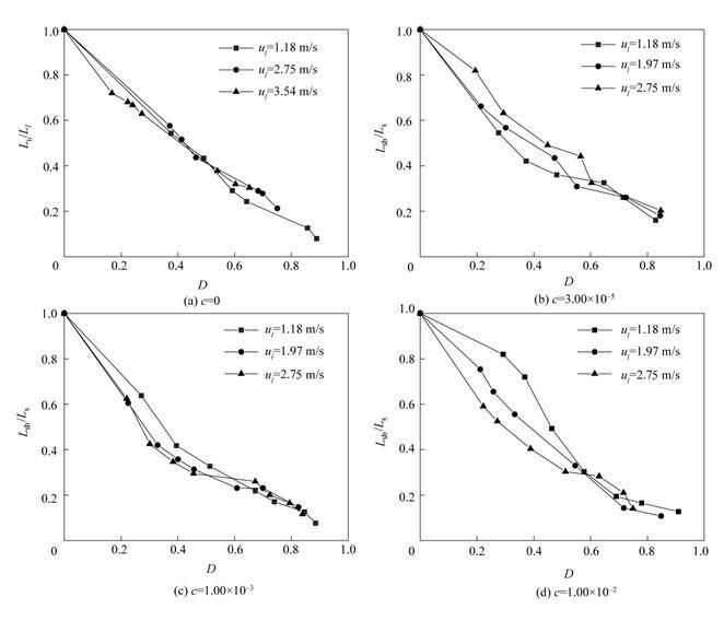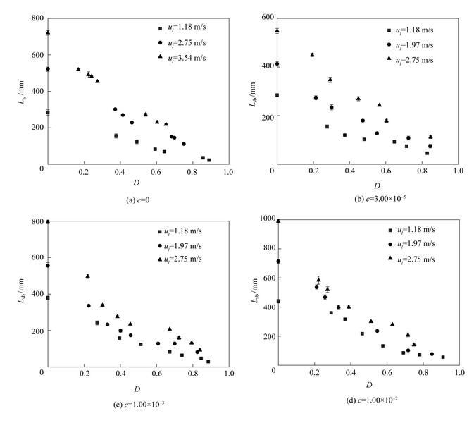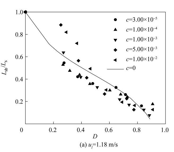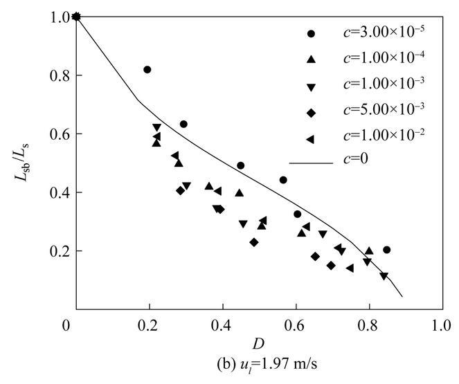 圖11是不同濃度表面活性劑射流破裂長(zhǎng)度L sb隨氣泡無(wú)量綱直徑D=d b/d 0(d b為氣泡直徑)的變化。從圖中可以看出,不同表面活性劑濃度下,射流破裂長(zhǎng)度隨氣泡無(wú)量綱直徑D的變化趨勢(shì)是相似的。射流破裂長(zhǎng)度隨著氣泡直徑的增大逐漸減??;當(dāng)氣泡直徑相同時(shí),提高液體射流速度會(huì)導(dǎo)致更大的射流破裂長(zhǎng)度。