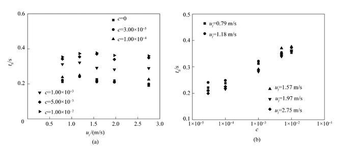 從圖7(a)中可以看出,當(dāng)表面活性劑濃度保持不變時(shí),射流破裂時(shí)間幾乎不隨射流速度的改變而改變。在射流速度保持不變時(shí),隨著表面活性劑濃度的增大,射流破裂時(shí)間呈現(xiàn)逐漸增長(zhǎng)的趨勢(shì)。在實(shí)驗(yàn)參數(shù)范圍內(nèi),射流破裂時(shí)間均小于0.4 s??紤]重力對(duì)液體射流的加速作用,液體射流實(shí)際破裂時(shí)間要小于0.4 s。