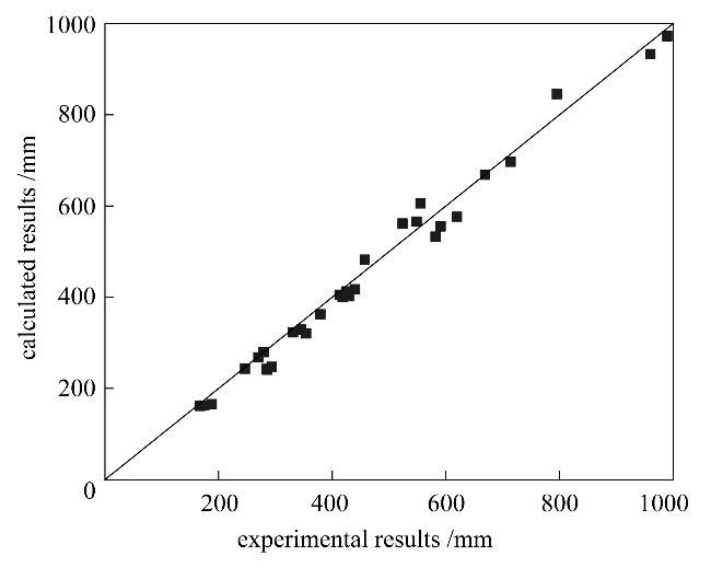 圖9射流破裂長(zhǎng)度實(shí)驗(yàn)測(cè)量值與擬合計(jì)算值的比較Fig.9Comparison between experimental results and calculated results