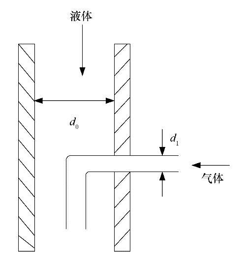 實(shí)驗(yàn)流程如圖1所示。來(lái)自注射泵的氣體通過(guò)充氣通道進(jìn)入噴嘴并在噴嘴內(nèi)形成氣泡,并與來(lái)自液體流量計(jì)的液體相混合形成氣液混合物。該氣液混合物離開(kāi)噴嘴后,在不穩(wěn)定波的作用下發(fā)生破裂,使用高速相機(jī)記錄這一過(guò)程,并使用開(kāi)源軟件ImageJ分析處理得到的圖片。實(shí)驗(yàn)通過(guò)控制注入噴嘴的氣體流量從而得到不同液體射流速度下直徑近似相等的氣泡。實(shí)驗(yàn)使用的噴嘴如圖2所示。其中,噴嘴內(nèi)徑d 0=2.96 mm,充氣通道外徑d 1=0.50 mm。