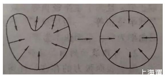 當你吹泡泡的時候,無論用什么泡泡圈,吹出來的泡泡都是近球形的,童鞋們會懊惱為什么:不能吹個泡泡都是愛你的形狀呢?從受力分析而言,當泡泡為不規(guī)則形狀時,其相鄰的兩點曲率不一樣,則表面張力方向不一樣,根據(jù)受力分析,水會向合力的方向流動,最后平衡狀態(tài)為相鄰兩點受力一致,曲率一致。推廣到整體,就是一整個球體形狀的形成。
