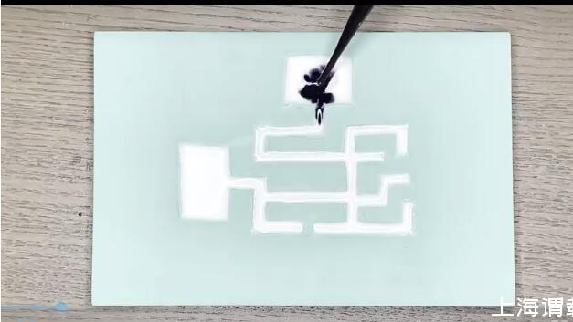 玄機(jī)主要在于后面滴加的染色液體上。可以看出,這個(gè)液體加到迷宮起點(diǎn)之后是會(huì)自動(dòng)選擇“正確的道路”來前進(jìn)的。雖然液體加太多之后會(huì)溢出到其他死胡同的方向,但是液體前端剛剛到達(dá)分岔路的時(shí)候,可以明顯地看到一個(gè)選擇性拐彎的趨勢,就像下面的動(dòng)圖這樣: