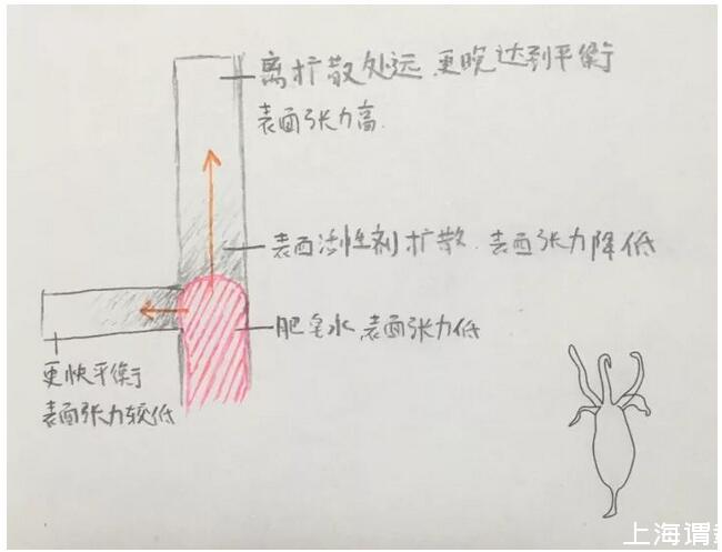 低表面張力的液體滴到高表面張力的液體當(dāng)中,由于表面張力不平衡,就會(huì)帶動(dòng)液體向表面張力高的一邊流動(dòng),這種現(xiàn)象被稱為Marangoni效應(yīng)。因?yàn)槲业瘟吮容^多的液體進(jìn)去,藍(lán)色液體前進(jìn)的動(dòng)力肯定不只是表面張力,但這個(gè)因素對液體“選路”非常重要。