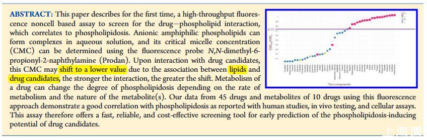 本文首次描述了一種與磷脂質(zhì)相關的高通量熒光。陰離子兩親磷脂可以在水溶液中形成復合物,其臨界膠束濃度(CMC)可以使用熒光探針N,N-二甲基-6-丙酰-2-萘胺(Prodan)測定。在與候選藥物相互作用時,由于脂質(zhì)和候選藥物之間的關聯(lián),該CMC可能會轉(zhuǎn)變?yōu)檩^低的值,相互作用越強,轉(zhuǎn)變越大。藥物的代謝可以根據(jù)代謝速率和代謝物的性質(zhì)改變磷脂質(zhì)的程度。我們使用這種熒光方法從45種藥物和10種藥物的代謝物獲得的數(shù)據(jù)證明了與人體研究、體內(nèi)測試和細胞分析報告的磷脂沉積癥有良好的相關性。因此,該測定提供了一種快速、可靠且具有成本效益的篩選工具,用于早期預測候選藥物的磷脂沉積誘導潛力。