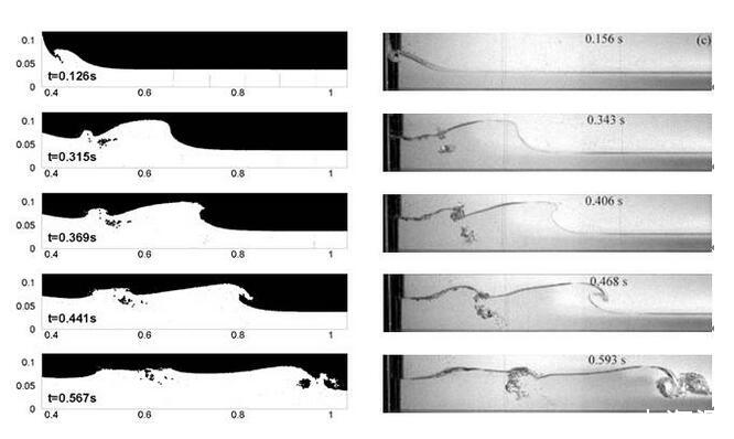 潰壩仿真結(jié)果(左)和實(shí)驗(yàn)結(jié)果[19](右)對(duì)比