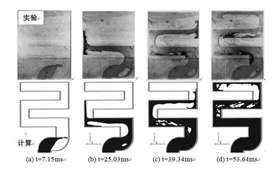 S形型腔充型過程的SPH數(shù)值模擬結(jié)果和實(shí)驗(yàn)結(jié)果[9]對(duì)比