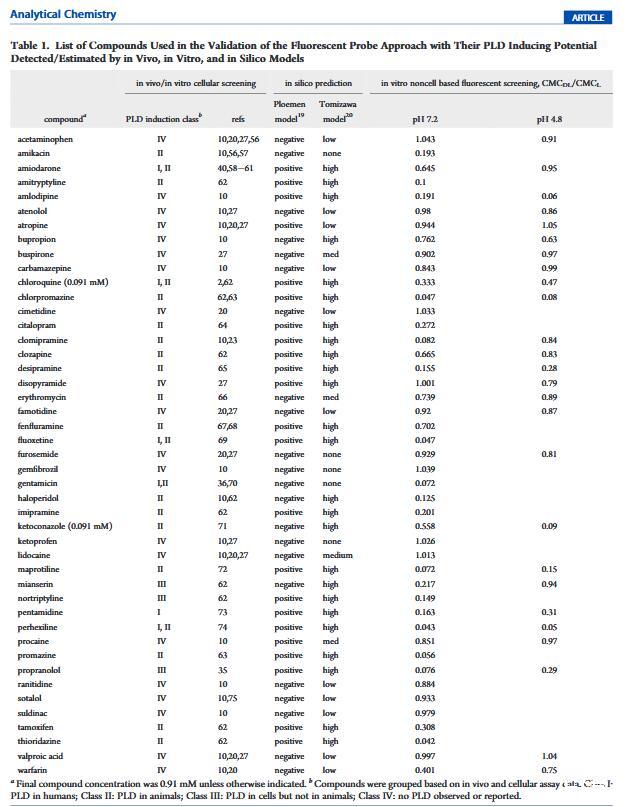 濃度依賴性。體內(nèi)研究中PLD的程度是劑量依賴性的。24,33在體外試驗中,濃度控制可用于估計劑量依賴性。一組七種報告的PLD誘導(dǎo)劑分別以三種不同的濃度進(jìn)行了測試:910、91和9.1μM(圖4)。對于氯喹和酮康唑,要么它們在10 mM時不能完全溶解在DMSO中,要么在使用10 mM DMSO儲備液時與緩沖液混合后鹽析出來,它們的最高濃度點被去除。所有化合物都表現(xiàn)出對CMC的濃度依賴性,以不同程度改變PLD誘導(dǎo)潛力。即使在910μM時,芬氟拉明似乎也是一種弱誘導(dǎo)劑,而硫利達(dá)嗪在不同濃度之間顯示出顯著變化。根據(jù)該體外數(shù)據(jù),在9.1μM的最低濃度下,七種化合物中沒有一種似乎能夠誘導(dǎo)PLD。復(fù)合自聚合。與磷脂類似,大多數(shù)PLD誘導(dǎo)劑是兩親性的。盡管帶有不同的電荷跡象,但它們也可以聚集并形成膠束。拉貝洛爾20,34和奎尼丁35被報道為PLD誘導(dǎo)劑;然而,在所應(yīng)用的測試條件下,我們無法確定任何一種藥物脂質(zhì)復(fù)合物的CMC。獲得的RFU值等于或低于空白(含熒光探針但不含脂質(zhì)的化合物)中的值。進(jìn)一步研究了不同藥物濃度但沒有脂質(zhì)(0 mg/mL脂質(zhì)),并且在無脂質(zhì)測定緩沖液中,拉貝洛爾和奎寧的CMC值分別為26和20μM。這些CMC值遠(yuǎn)低于這些化合物在PLD篩選中的測試濃度,并且懷疑化合物的自聚集會干擾藥物脂質(zhì)復(fù)合物形成的檢測,從而使CMCDL無法確定。