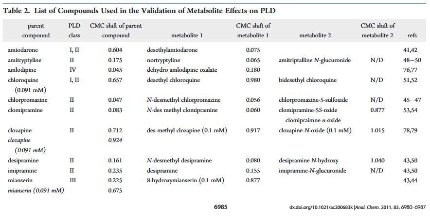 已經(jīng)有許多出版物描述了PLD藥物代謝產(chǎn)物所致。其中,初級(jí)代謝輕的胺碘酮,去乙基胺碘酮,已經(jīng)討論過14,38-40優(yōu)先積累代謝物已觀察到胺碘酮過量,尤其是短期39這為我們的檢測(cè)數(shù)據(jù)提供了可能的解釋其中去乙基胺碘酮是胺碘酮的主要代謝物,41,42表現(xiàn)出更高的PLD誘導(dǎo)潛力。相似地,8-羥基米安色林之間的CMC位移差異,米安色林、43,44和米安色林的主要氧化代謝物比其他兩個(gè)之間的差異更顯著成對(duì)的親本和代謝物。由于溶解度的限制,父母和代謝組的劑量濃度不同氯氮平和米安色林。這可能是導(dǎo)致觀察到的CMC偏移的顯著差異母體和代謝物之間。在較低濃度下測(cè)試時(shí)相比之下,氯氮平從低電位誘導(dǎo)劑轉(zhuǎn)變?yōu)榉钦T導(dǎo)劑,而米安色林仍然作為誘導(dǎo)劑但具有更高的CMCDL/CMCL值。值得注意的是,目前測(cè)試集中的大多數(shù)CAD被報(bào)告為氧化代謝其相應(yīng)的脫烷基初級(jí)代謝物。為了了解相應(yīng)初級(jí)的PLD電位代謝物,我們測(cè)試了額外的代謝物。之間測(cè)試的代謝物是初級(jí)去甲基代謝物氯丙嗪、45?47阿米替林、48?50丙咪嗪、43,50和pri-氯喹的瑪麗和次級(jí)脫乙基代謝物。51,52此外,由雜原子氧化形成的氧化代謝物地昔帕明43,50和氯胺酮的重釋和脫烷基代謝物pramine53,54進(jìn)行了評(píng)估。與其他CAD一樣,代謝物可以如果它們具有合適的理化性質(zhì),則誘導(dǎo)PLD。32相反,代謝物將失去結(jié)合能力如果CAD特征丟失,則使用脂質(zhì),例如用脂質(zhì)觀察氯米帕明N-氧化物和地昔帕明N-羥基(圖4和表2)。