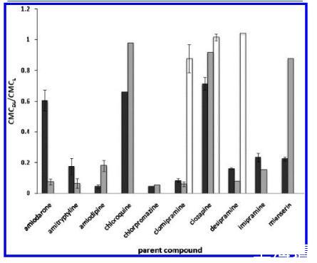 圖5.CMC偏移(由CMC之間的比率表示)藥物-脂質(zhì)復(fù)合物(DL)和單獨(dú)脂質(zhì)的CMC(L):CMCDL/CMCL)的測(cè)試化合物(黑色)及其主要代謝物(灰色、初級(jí)代謝物;白色,次生代謝物)在pH 7.2中分析HEPES緩沖液。使用的藥物濃度為1 mM,除非另有說明見表2。誤差線被分配給那些n g3測(cè)試的化合物。對(duì)于氯氮平和米安色林,均為0.91和0.091 mM用于測(cè)試,但僅來自1 mM測(cè)試的數(shù)據(jù)被策劃。
