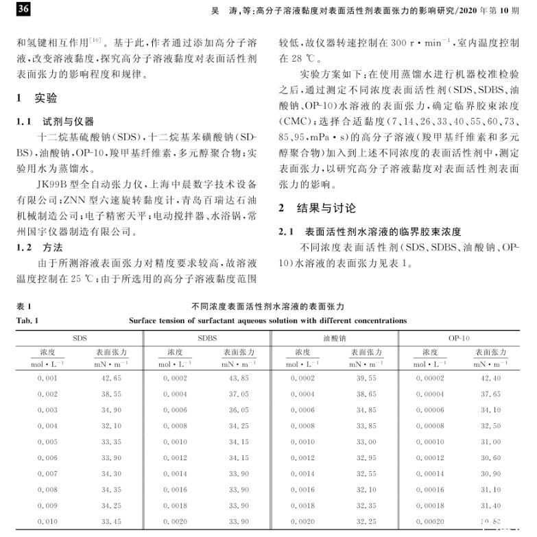 高分子溶液黏度對(duì)表面活性劑表面張力的影響研究
