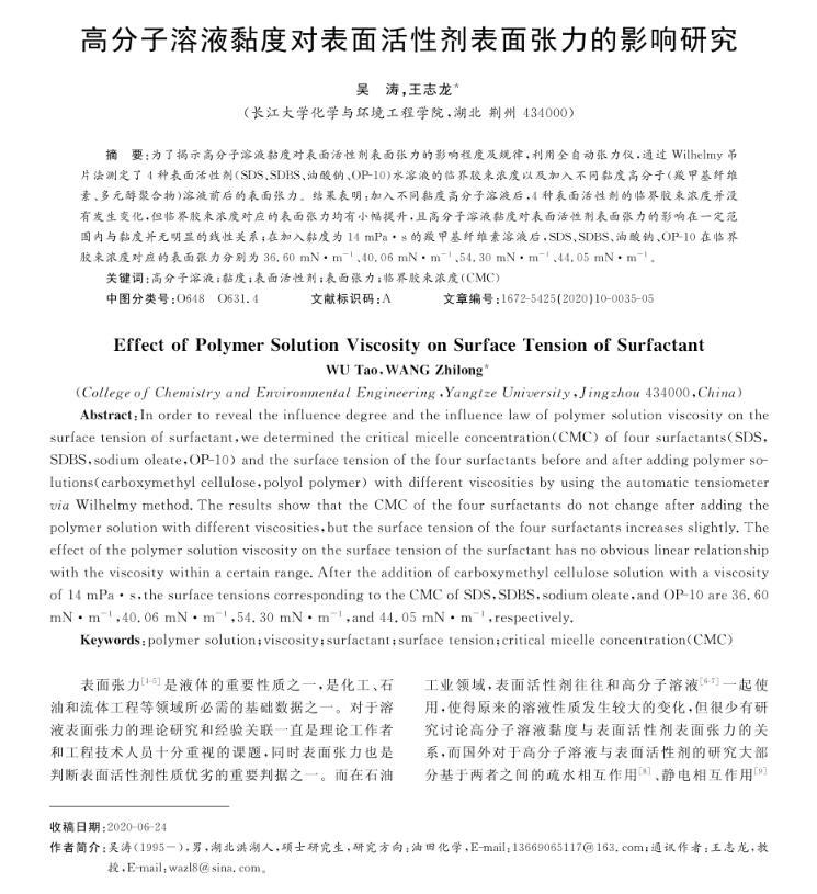 為了揭示高分子溶液黏度對(duì)表面活性劑表面張力的影響程度及規(guī)律,利用全自動(dòng)張力儀,通過Wilhelmy吊片法測(cè)定了4種表面活性劑(SDS、SDBS、油酸鈉、OP-10)水溶液的臨界膠束濃度以及加入不同黏度高分子(羧甲基纖維素、多元醇聚合物)溶液前后的表面張力。結(jié)果表明:加入不同黏度高分子溶液后,4種表面活性劑的臨界膠束濃度并沒有發(fā)生變化,但臨界膠束濃度對(duì)應(yīng)的表面張力均有小幅提升,且高分子溶液黏度對(duì)表面活性劑表面張力的影響在一定范圍內(nèi)與黏度并無明顯的線性關(guān)系;在加入黏度為14 mPa·s的羧甲基纖維素溶液后,SDS、SDBS、油酸鈉、OP-10在臨界膠束濃度對(duì)應(yīng)的表面張力分別為36.60 mN·m~(-1)、40.06 mN·m~(-1)、54.30 mN·m~(-1)、44.05 mN·m~(-1)。