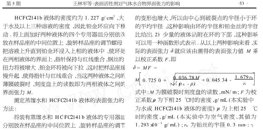 【摘要】:表面活性劑能夠減小液體的表面張力以及兩相液體間的界面張力,界面張力的減小有利于促進(jìn)氣體水合物快速形成和提高水合物儲(chǔ)氣能力.為定量研究?jī)上嘁后w間界面張力對(duì)氣體水合物形成的影響,用界面張力儀實(shí)測(cè)不同溫度時(shí)蒸餾水、HCFC-141b的表面張力以及HCFC-141b/蒸餾水、HCFC-141b/十二烷基硫酸鈉溶液(0.247%)、HCFC-141b/十二烷基磺酸鈉溶液(0.245%)、HCFC-141b/十二烷基苯磺酸鈉溶液(0.057 6%)的界面張力,測(cè)試結(jié)果表明,表面活性劑對(duì)降低兩相液體間界面張力的作用十分明顯,其中十二烷基苯磺酸鈉溶液對(duì)降低界面張力最為突出,降到HCFC-141b/蒸餾水界面張力值的9%左右,為定量研究氣體水合物等優(yōu)選表面活性劑提供了科學(xué)的依據(jù)。