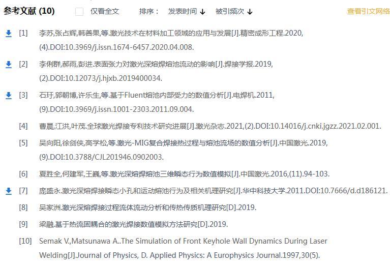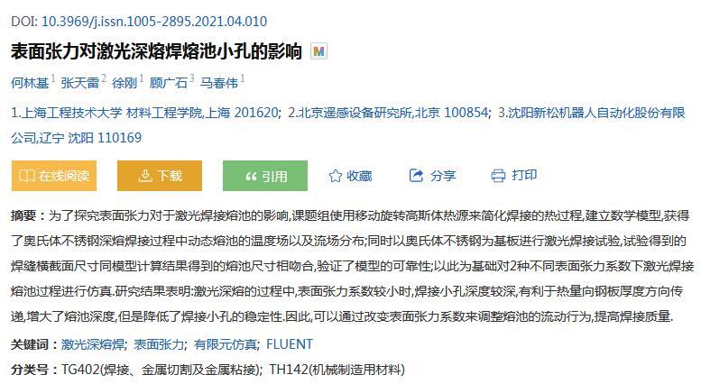 【摘要】:為了探究表面張力對于激光焊接熔池的影響,課題組使用移動(dòng)旋轉(zhuǎn)高斯體熱源來簡化焊接的熱過程,建立數(shù)學(xué)模型,獲得了奧氏體不銹鋼深熔焊接過程中動(dòng)態(tài)熔池的溫度場以及流場分布;同時(shí)以奧氏體不銹鋼為基板進(jìn)行激光焊接試驗(yàn),試驗(yàn)得到的焊縫橫截面尺寸同模型計(jì)算結(jié)果得到的熔池尺寸相吻合,驗(yàn)證了模型的可靠性;以此為基礎(chǔ)對2種不同表面張力系數(shù)下激光焊接熔池過程進(jìn)行仿真。