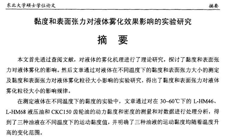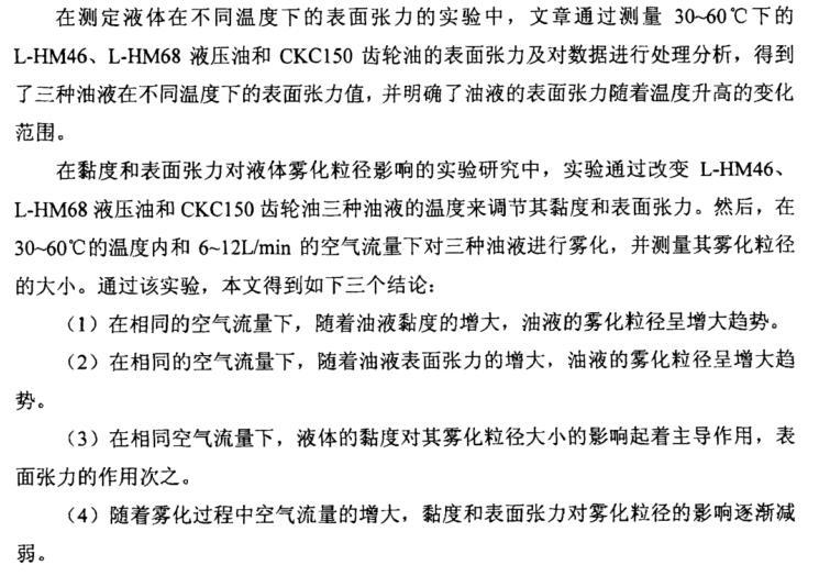 在黏度和表面張力對液體霧化粒徑影響的實驗研究中,實驗通過改變L-HM46、 L-HM68液壓油和CKC150齒輪油三種油液的溫度來調(diào)節(jié)其黏度和表面張力。然后,在30~60℃的溫度內(nèi)和6~12L/min的空氣流量下對三種油液進行霧化,并測量其霧化粒徑的大小。通過該實驗,本文得到如下三個結(jié)論: