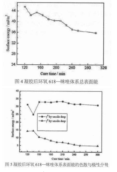 馬全勝通過研究恒溫固化過程中環(huán)氧樹脂體系凝膠后表面能的的變化規(guī)律,結(jié)合固化機(jī)制和反應(yīng)特性,分析環(huán)氧618-咪唑體系表面能的色散分量、極性分量的變化。