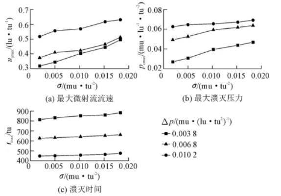 不同表面張力和初始空化泡內(nèi)外壓差條件下空化泡最大微射流流速、壓力和潰滅時(shí)間變化規(guī)律如圖3所示。隨著初始內(nèi)外壓差增大,不同表面張力條件下空化泡潰滅產(chǎn)生的最大微射流流速、最大潰滅壓力均隨之增大,但潰滅時(shí)間則隨之減小。初始空化泡內(nèi)外壓差為0.003 8 mu/(lu·tu2)時(shí),當(dāng)表面張力由0.001 9 mu/tu2增加到0.018 3 mu/tu2,最大微射流流速增加了55%,最大潰滅壓力增加了74%。初始空化泡內(nèi)外壓差增加到0.010 2 mu/(lu·tu2)時(shí),空化泡潰滅最大微射流流速僅增加了22%,潰滅壓力僅增加了6%,最大微射流流速和最大潰滅壓力增加幅度均隨著空化泡初始內(nèi)外壓差的增加而減小,說明空化泡初始內(nèi)外壓差的增加會(huì)減小表面張力對(duì)潰滅過程的影響。