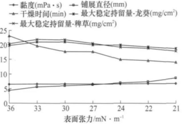 通過本研究可以說明適當?shù)亟档筒莞熟⒅苿┑谋砻鎻埩蛟黾羽ざ染商岣叱輨┑纳锘钚浴3輨┗钚阅芊癯浞职l(fā)揮往往決定于霧滴在雜草葉表面的黏著、展布、濕潤、滲透與傳導。不同雜草的葉片結構及生理機制往往對藥液理化性狀和藥液敏感性不同,本研究中液滴的鋪展直徑、干燥時間均采用石蠟模擬植物葉片蠟質層結構,僅能體現(xiàn)藥液理化性狀的相對變化趨勢,而不同類型的雜草對藥液物理性狀和藥液敏感性需進一步研究。