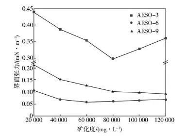 從圖2可以看出,隨著礦化度的增加,AESO-3的界面張力先降低后升高,AESO-6和AESO-9界面張力降低到平衡值后基本保持穩(wěn)定,在礦化度達(dá)到120 000 mg/L時(shí)界面張力仍能達(dá)到10-2mN/m數(shù)量級(jí),這說(shuō)明EO聚合度的增加提高了脂肪醇聚醚磺酸鹽的耐鹽性能。這一現(xiàn)象可以用無(wú)機(jī)鹽對(duì)表面活性劑在溶液中的聚集形態(tài)的影響來(lái)解釋[15]。通常表面活性劑中的雙親基團(tuán)各自趨向于自身親和力強(qiáng)的溶液中,在油水界面規(guī)則排列形成一層親水基向外、憎水基向內(nèi)的薄層,溶液中濃度達(dá)到一定時(shí),表面活性劑分子發(fā)生聚集形成膠束。加入適量無(wú)機(jī)鹽,無(wú)機(jī)鹽正離子受靜電作用會(huì)在親水基附近聚集能夠降低親水基之間的靜電排斥、改變表面活性劑在界面的堆積形態(tài),從而降低油水界面張力;隨著無(wú)機(jī)鹽濃度繼續(xù)增大,無(wú)機(jī)鹽離子對(duì)表層進(jìn)一步壓實(shí),油相無(wú)法進(jìn)入膠束中導(dǎo)致界面張力增大。而對(duì)于非離子-陰離子表面活性劑,中性親水基團(tuán)EO的引入減弱了無(wú)機(jī)鹽對(duì)界面親水基的靜電作用,從而使其在礦化度較高的時(shí)候仍然能夠保持良好的界面活性。