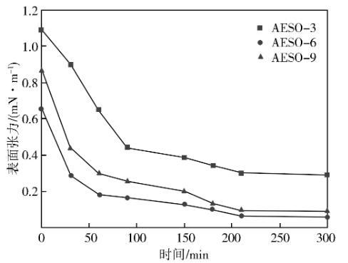 圖1 AESO-n水溶液與煤油的界面張力隨時(shí)間的變化