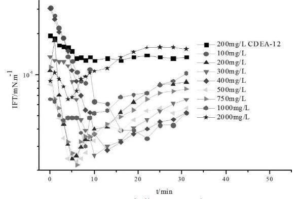 圖2濃度為200mg/LCDEA-12分別與不同濃度NNR復配油水動態(tài)界面張力關(guān)系