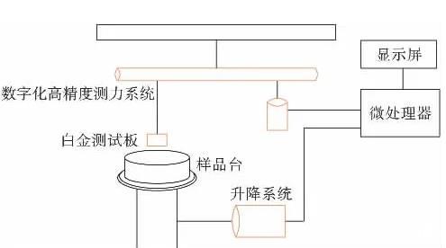 圖1為表面張力儀工作系統(tǒng)示意圖。硬件方面主要包括樣品臺、升降系統(tǒng)、數(shù)字化測力系統(tǒng)和微處理器。軟件方面由控制、分析專用軟件經(jīng)過微處理器的一系列運(yùn)算,將檢測到的微力轉(zhuǎn)化成表面張力值。由LCD數(shù)字顯示屏實(shí)時輸出表面張力值,如果需要,可通過RS232接口連接打印機(jī),打印數(shù)據(jù)或經(jīng)計算機(jī)采集相應(yīng)數(shù)據(jù)。該裝置結(jié)構(gòu)簡單,操作簡便,準(zhǔn)確性高。