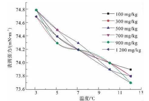 圖7為100、300、500、700、900、1 200 mg/kg濃度下,本實(shí)驗(yàn)自行合成的離子液體[HMIPS]Ss溶液的表面張力隨溫度變化示意圖。在低溫區(qū)間內(nèi)300 mg/kg溶液的表面張力曲線最低,說明該濃度的溶液表面活性最強(qiáng)。在所測溫度范圍內(nèi),整體上表面張力曲線遵循隨溫度升高而表面張力降低的一般規(guī)律,但相差不大,同一條曲線3℃和12℃表面張力值相差0.9~1.1 mN/m。