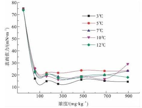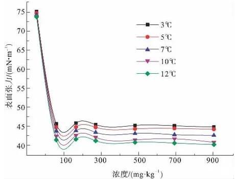 圖2為3、5、7、10、12℃下,陰離子表面活性劑CTAB溶液的表面張力隨濃度變化示意圖。由圖2可知,CTAB是比較優(yōu)良的表面活性劑,在低濃度下就能夠顯著降低溶液表面張力,在300 mg/kg-1時表面張力達(dá)到最低值,之后隨濃度增大,表面張力變化不大,因此CTAB的臨界膠束濃度CMC即在此濃度范圍附近。在所測溫度范圍內(nèi),當(dāng)CTAB溶液達(dá)到CMC以后,表面張力值在14.5~23.5 mN/m之間。隨溫度變化,表面張力值相差較大。
