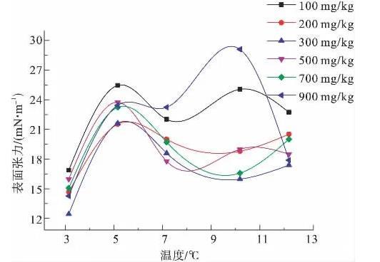 圖5為100、200、300、500、700、900 mg/kg濃度下,陰離子表面活性劑CTAB溶液的表面張力隨溫度變化示意圖。由圖5可知,300 mg/kg溶液的表面張力曲線最低,說明該濃度的溶液表面活性最強(qiáng)。在所測溫度范圍內(nèi),隨溫度升高表面張力變化較大,整體上表面張力曲線呈波浪狀,出現(xiàn)拐點(diǎn)。6條曲線在3℃時均出現(xiàn)最低表面張力值,在5℃附近均出現(xiàn)波峰;100、500和900 mg/kg溶液在7℃附近時出現(xiàn)波谷,10℃附近再次出現(xiàn)波峰;200、300和700 mg/kg溶液在10℃附近出現(xiàn)波谷。