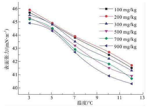 圖6為100、200、300、500、700、900 mg/kg濃度下,非離子表面活性劑P123溶液的表面張力隨溫度變化示意圖。由圖6可知,隨濃度增大,溶液降低表面張力的能力逐漸增大,但各個濃度曲線差值不大,900 mg/kg濃度溶液表面活性最強(qiáng)。在所測溫度范圍內(nèi),整體上表面張力曲線幾乎呈直線狀,遵循隨溫度升高而表面張力降低的一般規(guī)律,斜率幾乎不變,未出現(xiàn)拐點(diǎn),且相差較大,同一條曲線3℃和12℃表面張力值相差4.2~4.6 mN/m。
