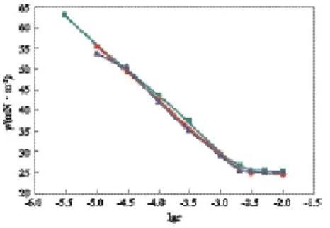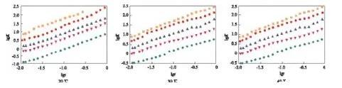 在lgc=-3.00時(shí),可看出較完整的動(dòng)態(tài)表面張力降低曲線,開始時(shí)表面張力接近溶劑的表面張力,隨時(shí)間的延長(zhǎng)表面張力先快速下降,降至一定數(shù)值后,降幅趨緩,在一段時(shí)間內(nèi)基本保持不變。因?yàn)闅?液界面新生成時(shí),GSS362尚未在表面吸附,界面張力為溶劑的表面張力,隨著時(shí)間的延長(zhǎng),表面活性劑分子開始在表面吸附,氣/液界面張力降低,隨著吸附的進(jìn)行,表面逐步趨于飽和,表面活性劑分子在表面吸附的速率下降,因而動(dòng)態(tài)表面張力下降速率變慢,趨于平衡。
