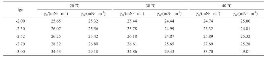 采用JK99C型表面張力儀由低濃度至高濃度測(cè)定恒溫后系列溶液的表面張力(γ),做γ-lgc(c為濃度)曲線。測(cè)試均在帶有恒溫夾套的玻璃杯中進(jìn)行,外接數(shù)控超級(jí)恒溫槽,溫度控制在預(yù)設(shè)溫度,溫度選擇為20,30,40℃。