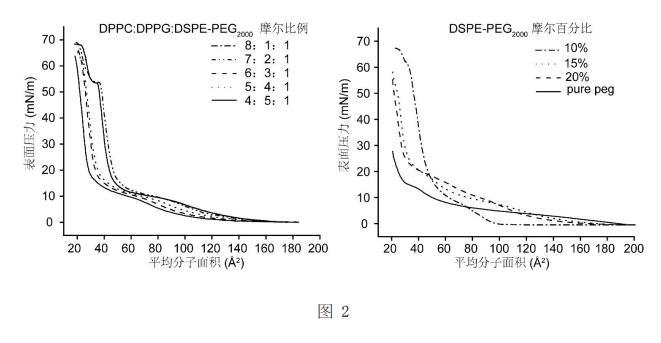 ,并在20℃下以10 mm/min的速率壓縮薄膜,記錄表面張力-表面積曲線。如圖2所示在一系列磷脂配方中,DSPE-PEG2000