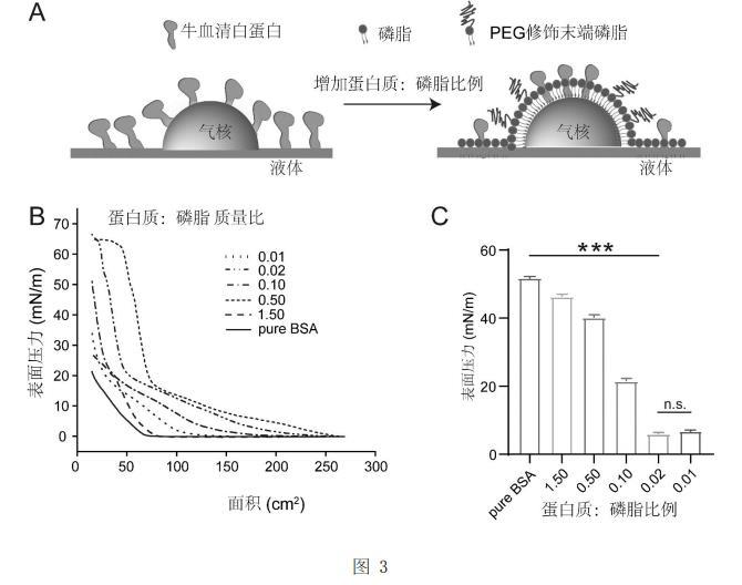的比例為8:1:1的時(shí)候氣液界面的的表面壓力達(dá)到69mN/m,因此具有最低的氣液界面表面張力(2mN/m)。為了探究蛋白質(zhì)與磷脂在氣液界面組裝的規(guī)律,如圖3中的A所示,選用牛血清白蛋白(BSA)作為標(biāo)準(zhǔn)蛋白質(zhì),配置好一系列不同蛋白質(zhì)與磷脂質(zhì)量比的磷脂蛋白質(zhì)復(fù)合物,并用微量注射器將20μL磷脂蛋白質(zhì)復(fù)合物(1mg/mL脂濃度)氯仿溶液涂在Langmuir-Blodgett多功能膜天平上,使氯仿蒸發(fā)10分鐘。將表面的初始面積設(shè)置為282cm2