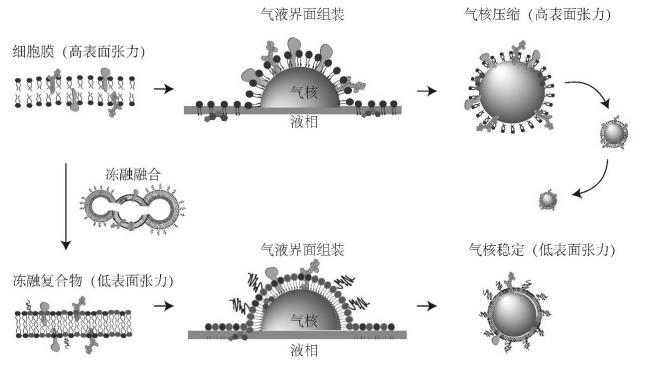 細(xì)胞膜是由蛋白質(zhì)與膽固醇等分子鑲嵌在磷脂中的典型雙分子層結(jié)構(gòu)。細(xì)胞膜仿生技術(shù)已經(jīng)成功實(shí)現(xiàn)在納米顆粒以及納米液滴表面修飾組裝,并實(shí)現(xiàn)體內(nèi)的長(zhǎng)循環(huán)以及良好生物相容性。典型的細(xì)胞膜仿生技術(shù)是將剝離后的細(xì)胞膜直接以磷脂雙分子層的形式包被于納米顆粒或液滴表面。然而由于表面張力作用,細(xì)胞膜的磷脂雙分子層無(wú)法直接包被在微米級(jí)的氣泡表面。